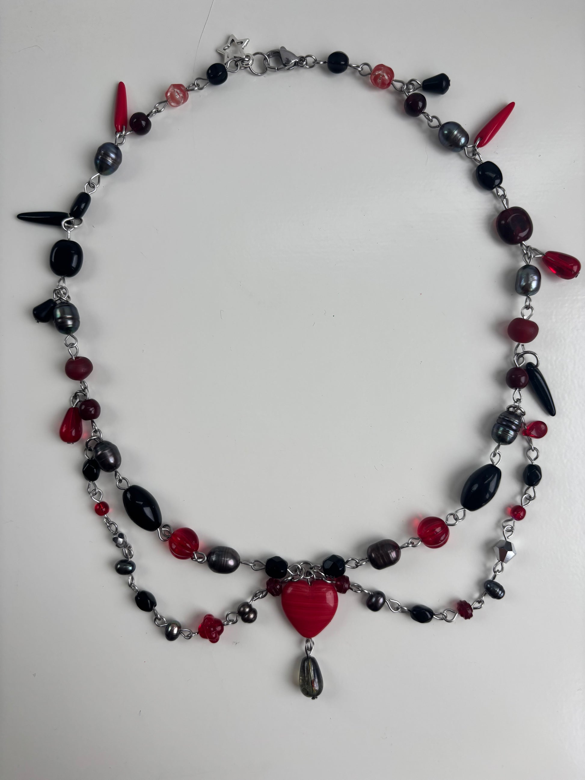 handmade necklace, made with black and red glass beads and peacock pearls with a red heart pendant